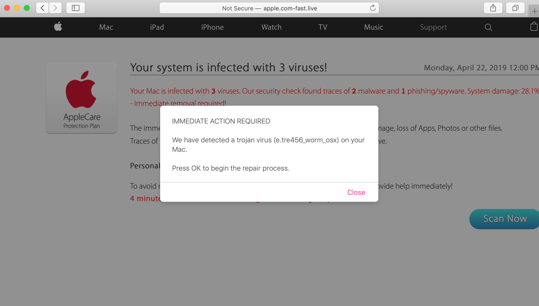 apple.com-fast.live scam - ¿Como eliminarlo? 1 mayo, 2019 By Giedrius Majauskas Los mensajes falsos de Apple.com-fast.live podrán empezar a perturbarle mientras navega mientras espera que nada malo ocurra a su Mac. El pop-up de apple.com-fast.live es el típico aviso perturbador que pretende asustarle para que descargue e instale PUPs (programas potencialmente no deseados). Le advertimos que sea precavido cuando se encuentre con estas alertas. No los trate como avisos reales de Apple. Lo que ve en su pantalla es el resultado de una actividad maliciosa de ciber fraudes en la web que intentan hacer que desperdicie su dinero por nada. El mensaje básico realizado por apple.com-fast.live es que su Mac está infectado con virus serios. La alerta podrá aparecer varias veces tras visitar webs legítimas, pero en su lugar, el navegador le redirige a sitios de terceras partes como apple.com-fast.live. La alerta usa el logo de Apple y AppleCare Protection Plan, así que, para algunas personas, puede que les parezca una alerta real de la empresa Apple, pero definitivamente no lo es. Ha habido algunos otros sitios maliciosos similares en el pasado, por ejemplo, apple.com-cleaning-os.live y apple.com-fixing.live. Consecuencias del ataque apple.com-fast.live Desde que la alerta de apple.com-fast.live aparece, los usuarios encuentran el siguiente aviso aterrador: ¡Su sistema está infectado con 3 virus! Su Mac está infectado con 3 virus. Nuestra comprobación de seguridad ha encontrado 2 restos de malware y 1 phishing/spyware. Daños del sistema: 28.1% – ¡Eliminación inmediata requerida! La eliminación inmediata de los virus es necesaria para evitar daños futuros en el sistema, pérdidas de Apps, Fotografías u otros archivos. Se han encontrado restos de 1 phishing/spyware en su Mac con MacOS 10.14 Mojave. La información personal y bancaria está en riesgo. Para evitar más daños haga clic en ‘Escanear Ahora’ inmediatamente. ¡Nuestro escaneado en profundidad le proporcionará ayuda inmediatamente! 4 minutos y 27 segundos restantes antes de que los daños sean permanentes. Es obvio que el aviso aterrador se ve acompañado por las instrucciones para que los usuarios hagan clic en el botón “Escanear Ahora”. Hacerlo mostrará una imitación de algún escaneado online ficticio, luego habrá informes similares sobre otras amenazas más serias que ha encontrado en el sistema. Finalmente, el pop-up instruye a las personas para que descarguen alguna herramienta que prometen que arreglará los problemas reportados. Los pop-ups Apple.com-fast.live poseen las herramientas de secuestrador de navegador. Aparecen en Google Chrome, Safari y Mozilla Firefox y podrá cambiar automáticamente estos navegadores y ponerlos en modo pantalla completa. Esto se hace para dificultar a los usuarios el cerrar la ventana pop-up y que estén obligados a ver y revisar esos escaneados falsos y finalmente descargar el pseudo-software de seguridad. Por qué ve las alertas apple.com-fast.live La web apple.com-fast.live está directamente relacionada con fraudes online cuya intención es engañarle para que desperdicie su dinero. Pero ¿cómo ha aparecido este mensaje en particular sin su intención de visitar la web relacionada? Este comportamiento de navegador inusual se ve explicado por la integración del adware en su sistema. El adware ha secuestrado su navegador y ahora está dirigiendo su atención a muchos sitios de terceras partes. El pop-up de apple.com-fast.live podría ser una de otras muchas redirecciones peligrosas que podrían aparecer. El adware tiene el objetivo de conseguir beneficios para las personas que lo distribuyen. Como ya se ha mencionado, las notificaciones aterradoras de apple.com-fast.live intentan forzar a los usuarios para que descarguen un software de seguridad malicioso, así que, cuando alguien lo instala o lo compra, los distribuidores del adware consiguen su parte del pastel. Hoy en día, el adware podría distribuirse a través de diferentes canales. Una de las maneras más comunes de inyectar adware sin que el usuario lo sepa es el método del “enlazado”. Este método se usa durante la instalación de software gratuita. Puede que encuentra una aplicación gratuita genial en la web y decida instalarla. Sin embargo, el instalador puede que le sugiera adicionalmente que pruebe algún otro software como una oferta excepcional. A veces esta información no se divulga por completo, así que, cuando acepta todos los pasos mencionados en el instalador durante el proceso de instalación, automáticamente da su permiso para instalar los programas no deseados. Así es como funciona el “enlazado”. Eventualmente, verá algunos programas que no ha instalado usted, sino que han sido inyectados en el sistema durante la instalación de software gratuito. Cómo eliminar apple.com-fast.live La buena recomendación para evitar las alertas falsas de apple.com-fast.live es ser precavido al navegar por Internet y especialmente cuando descargue software gratuito. Podría haber evitado la intrusión del adware si fuese más precavido durante la instalación de programas gratuitos. Leer los datos proporcionados por el instalador es de vital importancia. De esta manera, será capaz de desmarcar todos los programas no deseados para que no se instalen en su sistema de manera predeterminada. Otra buena idea para evitar los mensajes aterradores de apple.com-fast.live es confiar la protección de su Mac a otro programa de seguridad decente. Probablemente tenga algún anti-malware en Mac, ¿no? Si las alertas de apple.com-fast.live aparecen en su pantalla con un antimalware ejecutándose, entonces ¿por qué tener ese antimalware si no ha protegido su Mac? Cambie a algún otro programa que pueda protegerle mucho mejor. Con relación a la eliminación de la estafa apple.com-fast.live, primero pruebe a desinstalar las aplicaciones sospechosas de su Mac en el área de “Aplicaciones”. Puede ordenar los