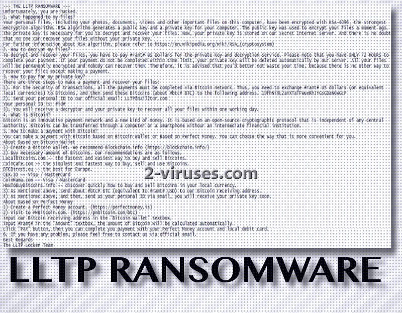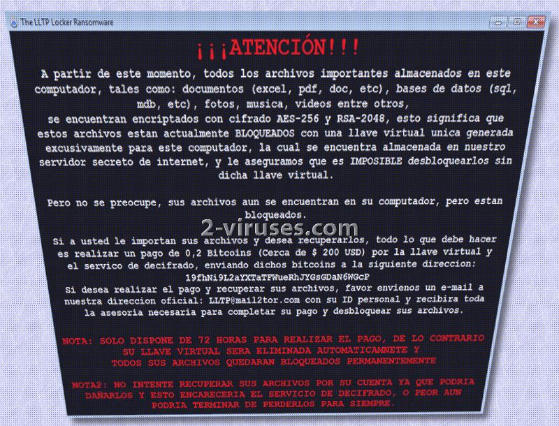 El ransomware LLTP - ¿Como eliminarlo? 15 abril, 2017 By Giedrius Majauskas El cripto virus LLTP (Locker) está clasificado entre las muestras ransomware que usan una combinación de cifrados para complicar el proceso de desencriptación de sus víctimas. Primero se aplica un algoritmo AES para arruinar los datos con la clave de encriptación pública, mientras que la clave privada se encripta con criptografía RSA. Después de que estos procesos terminen, los datos de los usuarios ya no se podrán usar. En la nota de rescate, los hackers se refieren a sí mismos como el Equipo LLTP Locker y piden que todos los pagos se realicen a través de un sistema anónimo: bitcoin. [email protected] es la dirección de email a la que las víctimas pueden acudir si tienen dificultades a la hora de enviar el pago necesario. El email también será necesario para contactar con ellos después de realizar el pago con éxito a la cartera de bitcoins 19fhNi9L2aYXTaTFWueRhJYGsGDaN6WGcP. Se da un período de 72 horas para que la gente se decida y se anime a pagar el valor del rescate. Incluso aunque los hackers digan eliminar de manera permanente la clave de desencriptación privada después de que pase cierto tiempo, aún no creemos que pagar el rescate sea la mejor opción. Procedimientos que inicia el ransomware LLTP El cripto virus LLTP parece tener un par de cosas en común con las infecciones TrumpLocker y VenusLocker. Su bloqueador de pantalla incluye la misma fotografía con una versión de dibujos de una silueta oscura, que lleva la icónica máscara de Anonymous. Parece que este ransomware no se ve influenciado por el hecho de que podría no haber conexión a Internet en el dispositivo infectado. La encriptación de archivos puede iniciarse en modo sin conexión. El dominio Moniestealer.co.nf parece ser el que el virus LLTP usa para contactarse y proporcionar algunos detalles sobre la víctima infectada. Como respuesta, los hackers no dudarán en enviar una clave pública para la encriptación. Sin embargo, para que se llegue a este escenario, el dispositivo tiene que estar conectado a Internet. Si no es así, el ransomware LLTP aún podrá realizar con éxito el inicio de la encriptación. El ransomware creará nuevas carpetas y subcarpetas para guardar ejecutables maliciosos y coloca todos los datos encriptados en una ubicación llamada ‘vault’. También genera un archivo RAR pero el propósito de este archivo todavía no se ha determinado. Mientras trata con sus asuntos el virus LLTP iniciará un comando para eliminar todas las Shadow Volume Copies ya que esta característica puede ayudar a la gente a restaurar sus archivos de manera completamente gratuita. Ransom notes are called ReadMe.txt ad LEAME.txt. También hay una versión española de la nota de rescate, lo que significa que no sólo intenta infectar a los usuarios de habla inglesa. Los datos encriptados incluyen una larga y única extensión: .ENCRYPTED_BY_LLTP. Va tras una gran cantidad diferente de archivos, lo que significa, que no tendrá ningún problema en saber que ejecutables encriptar con AES -256. ¿Cómo puedo restaurar mis archivos? El ransomware LLTP los ha arruinado Si nos está haciendo esta pregunta, no podemos darle buenas noticias. La desencriptación todavía está pendiente, pero esperamos que no se vea tentado a pagar el rescate que piden los hackers. Presumiblemente, le pedirán unas 0.2 Bitcoins que son aproximadamente unos 203.66 dólares americanos. Si está preocupado por si la creación de las herramientas de recuperación de archivos sea un problema, debe recordar que ya hay una gran cantidad de herramientas. Puede intentar desencriptar sus archivos con cualquiera de ellas: podrían funcionar. Sin embargo, como el ransomware LLTP amenaza con destruir de manera permanente los archivos, debe copiar todos los archivos infectados en una ubicación segura (memoria USB o algo diferente). Luego, elimine la infección. Esta tarea se puede llevar a cabo de manera automática o manual. Spyhunter o Hitman le ayudarán en la eliminación automática. Para las posibles opciones de desencriptación, debería leer este artículo entero. Distribución del ransomware LLTP Los hackers distribuirán el ransomware LLTP de un par de maneras. Para empezar, enviarán campañas de spam que ofrecerán descargar adjuntos, que serían cargas de una infección. No debe abrir mensajes aleatorios de su bandeja de entrada, e intente mantener su dispositivo limpio de archivos desconocidos. Además de eso, reaccionar a anuncios engañosos y visitar webs cuestionables, también puede dar lugar fácilmente a una infección con malware. Si desea tener una navegación más segura, le recomendamos que sea cliente de dominios y servicios legítimos. ¿Cómo eliminar El ransomware LLTP usando Restauración del Sistema? 1. Reinicie su ordenador en Modo Seguro con Solicitud de Comando 1. Modo seguro Para Windows 7/ Vista/ XP l Inicio → Apagar → Reiniciar → OK. l Presione la tecla F8 repetidamente hasta que la pantalla de Opciones de Inicio Avanzado aparece. l Elegir Modo Seguro con Solicitud de Comando. Para Windows 8 / 10 l Presione Potencia en la pantalla de acceso de Windows. Luego presione y mantenga la tecla Shift y haga clic en Reiniciar. l Elija solucionar problemas → Opciones Avanzadas → Configuración de Inicio y haga clic en Reiniciar. l Cuando se cargue, seleccione Permitir Modo Seguro con Solicitud de Comando en la lista de Configuraciones de Inicio. 2. Restaurar archivos y configuraciones del Sistema. l Cuando el modo de Solicitud de Comando se cargue, introduzca cd restore y presione Intro. l Luego introduzca rstrui.exe y presione Intro otra vez. l Haga clic en “Siguiente” en la ventana que apareció. l Seleccione uno de los Puntos de Restauración que están disponibles antes de que se infiltrase el LLTP ransomware en su sistema y luego haga clic en “Siguiente”. l Para iniciar la restauración del Sistema haga 