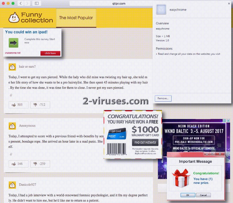 El virus Qtipr.com - ¿Como eliminarlo? 5 mayo, 2017 By Giedrius Majauskas A pesar del hecho de que la mayoría de secuestradores de navegador han sido creados como proveedores de búsquedas, esta vez nos hemos topado con una muestra de hijackware diferente. Qtipr.com parece centrarse en publicar confesiones de gente desconocida que tiene miedo de expresar sus secretos en la vida real. Es una tendencia muy popular hoy en día, que la gente tiene miedo de verse juzgada y rechazada. Los dominios que permiten a los usuarios enviar sus historias y son visitados por millones de personas cada día. Sin embargo, dudamos que mucha gente visite de manera voluntaria el dominio Qtipr.com. Los investigadores de seguridad han indicado que esta web se vuelve de manera inesperada la página de inicio y página de nueva pestaña de los usuarios. Mientras analizamos el virus Qtipr.com, hemos leído algunas declaraciones desafortunadas de personas y sentimos empatía por su historia. Sin embargo, si nota que el virus Qtipr.com está presente en su sistema, no debe ignorar los riesgos potenciales que derivan de él. Puede incluir una gran cantidad de contenido de terceras partes y no es algo que siempre sea seguro de ver. Si su dispositivo está siendo redirigido aleatoriamente al virus Qtipr.com, esta es otra señal de una infección con un secuestrador de navegador. Aprender más sobre el virus Qtipr.com: ¿cómo consigue acceso a su sistema? El virus Qtipr.com podría ser un poco diferente de los secuestradores de navegador más comunes, con relación a su contenido, pero eso no cambia el hecho de que invade la privacidad de la gente y hace modificaciones sin tener los permisos apropiados. Qtipr.com será visto en lugar de la página de inicio y página de nueva pestaña previamente seleccionadas. Podría pensar que este cambio sólo es un detalle irrelevante, pero estaría equivocado al hacer ese tipo de conclusiones. Si nota que su configuración ha sido reemplazada, no dude en ejecutar un escaneado completo de seguridad para descubrir si un secuestrador de navegador ha invadido su privacidad o no. Si sus preferencias han cambiado, casi no hay dudas de que un parásito de malware se ha introducido en su dispositivo. Es lo suficientemente intrusivo para preparar un VBSCript para el WMI. Se hace para poder realizar las modificaciones de las configuraciones de navegador. Esto es una situación problemática, ya que algunas herramientas antimalware no logran detectar ese tipo de invasiones. Sin eliminar de manera adecuada el VBScript inyectado, los usuarios no serán capaces de eliminar el virus Qtipr.com. Los investigadores de seguridad también han notado que junto con el virus Qtipr.com, han detectado una nueva extensión de navegador llamada EasyChrome. Si esta extensión está presente en sus navegadores, entonces puede leer el contenido de las webs visitadas e incluso hacer alteraciones. Esto significa que esta extensión es capaz de añadir contenido promocional de terceras partes. Como está versión secreta de EasyChrome 1.0 se infiltra sin el consentimiento de los usuarios, podría ni ser consciente del hecho de que una extensión maliciosa está interfiriendo con su navegación. Junto con el virus Qtipr.com, estos dos parásitos van a hacer su mejor esfuerzo para promocionar contenido de terceras partes y generar tráfico web. Una de las características más perturbadoras que debe hacer saltar las alarmas es la posibilidad de encontrarse con material cargado de malware. El virus Qtipr.com o la extensión que viaja con él puede mostrar anuncios aparentemente curiosos, pero no debe asumir directamente que son legítimos y fiables. Introducción de las maneras en las que el virus Qtipr.com puede infectar su dispositivo El virus Qtipr.com puede introducirse en su sistema de una manera completamente inaceptable. Sin embargo, los desarrolladores maliciosos no necesariamente se preocupan sobre los códigos morales ni nada similar. En su opinión, si una persona no es lo suficientemente precavida, ¿por qué no deberían aprovecharse de esas oportunidades? Es verdad que, si es lo suficientemente precavido, las infecciones como el virus Qtipr.com no serán relevantes. Sin embargo, mantenerse alerta durante 24 horas 7 días a la semana es una tarea difícil; especialmente cuando los hackers tienen planes elaborados para distribuir malware. Sin embargo, podemos recomendarle protegerse de las campañas de spam al no abrir los correos que parezcan falsos. Además de eso, descargue programas de fuentes fiables que se hayan ganado el respeto de los especialistas informáticos. Durante los procesos de instalación de los programas gratuitos, siempre esté preparado para seleccionar modos avanzados/personalizados en lugar de usar los básicos y rápidos. Una versión simplificada de una instalación no es una opción que deba seleccionar si su objetivo es mantener su dispositivo libre de malware. Spyhunter le proveerán una seguridad eficiente y no permitirán al virus Qtipr.com que mantenga su presencia en su dispositivo. A continuación, puede encontrar los consejos para llevar a cabo una eliminación sin ningún problema. El Virus Qtipr Com quicklinksAprender más sobre el virus Qtipr.com: ¿cómo consigue acceso a su sistema?Introducción de las maneras en las que el virus Qtipr.com puede infectar su dispositivoHerramientas de extracción Malware automáticaEliminación manual del virus Qtipr.comComo eliminar virus Qtipr.com por medio del Panel de Control de WindowsHerramientas de extracción Malware automática Descargar Spyhunter para detectar Malware(Win) Nota: Ensayo Spyhunter proporciona la detección de parásitos como El Virus Qtipr Com y ayuda a su eliminación de forma gratuita. versión de prueba limitada es disponible, Terms of use, Privacy Policy, Uninstall Instructions, Descargar Combo Cleaner para detectar Malware(Mac) Nota: Ensayo Combo Cleaner proporciona la detección de parásitos como E