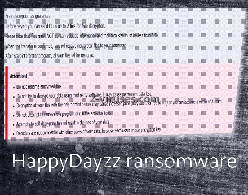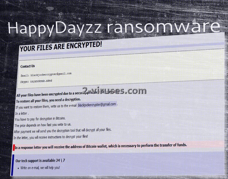 HappyDayzz ransomware - ¿Como eliminarlo? 26 marzo, 2017 By Giedrius Majauskas A primera vista, cuando el cripto-virus HappyDayzz dio sus primeros pasos, los investigadores de seguridad fueron impacientes al asociarlo con el ransomware Globe, ya que ambos incluían notas de rescate similares. De hecho fue un error normal, ya que las instrucciones parecían prácticamente idénticas. Sin embargo, pronto se determinó que el ransomware HappyDayzz era otro virus independiente. Incluye un servicio de atención al cliente que dice está disponible en todo momento. La gente que es lo suficientemente desafortunada para ser víctimas de esta infección, debe contactar con los desarrolladores de HappyDayzz a través de la dirección de Skype nsyaneksab.aked o [email protected]. Durante esta conversación, los hackers revelarán la cantidad exacta de bitcoins que pide como pago para la desencriptación. Además de eso, informarán a las víctimas de a qué cartera de bitcoin deben enviarlas. Informe completo sobre el ransomware HappyDayzz Después de que el cripto-virus HappyDayzz haya encriptado los archivos, no sólo dañará su funcionalidad, sino que cambiará los nombres a otros irreconocibles. Antes de que adjunte el título original [email protected]. Luego, el nombre anterior cambiará a una frecuencia aleatoria de letras y números. Después, habrá una extensión única, idéntica a todos los datos corruptos: .happydayzz. Como ya sabrá, los archivos que pasan por estos cambios, acaban siendo inútiles. Por ejemplo, los datos encriptados se parecerán a esto: [email protected].[combinación_aleatoria].happydayzz. Los hackers explican que la única manera segura de recuperar los archivos es contactar con ellos y descubrir más sobre cómo debe hacer el pago. En la nota de rescate principal, los hackers no indican nada de su cartera de bitcoin, ni dan la cantidad exacta del pago. Sin embargo, recomiendan que las víctimas les envíen dos archivos encriptados. Los criminales los desencriptarán de manera gratuita y demostrarán que pueden recuperar los datos. Incluso si dicen la verdad, no debe pagar la desencriptación que le ofrecen. Ya que los hackers saben que al restaurar archivos grandes de manera gratuita, podrían ayudar a los investigadores de seguridad a crear una herramienta: por esta razón, los 2 archivos enviados deben ser menores a 5MB. Según los informes de las víctimas (y parece que esta variante está siendo distribuida actualmente), los desarrolladores del ransomware HappyDayzz han decidido usar una encriptación AES. El archivo que proporciona las instrucciones se llama Cómo Recuperar Archivos Encriptados.hta. Las fotografías anteriores ilustran como es el archivo. No se deje engañar por el título de “Globe” que se muestra en la parte superior. A pesar de ser similares, estas dos infecciones parecen haber sido creadas por dos hackers diferentes. ¿Qué pasa con los archivos que ha dañado el ransomware HappyDayzz? Las víctimas han visto que las herramientas universales para desencriptación no les han funcionado. No se decepcione tan fácilmente: hay otras maneras de recuperar archivos. No tenemos información sobre si el virus HappyDayzz elimina las Shadow Volume Copies. Por esta razón, cada víctima debe ver si están intactas. Si siguen ahí, será capaz de restaurar los archivos. Si ha podido guardar sus archivos en copias de seguridad antes de que se encriptasen, no tendrá ninguna dificultad para recuperar los archivos de estas fuentes de almacenamiento. Antes de hacerlo, se le recomienda eliminar el ransomware HappyDayzz porque si logra desencriptar los archivos con la infección todavía presente, el virus simplemente podría volver a encriptar los archivos. Para la eliminación del ransomware, debe usar una herramienta antimalware. Spyhunter o Malwarebytes tratarán con infecciones de ransomware sin descanso. ¿Qué fuentes del ransomware HappyDayzz podemos identificar? El virus HappyDayzz puede estar usando trucos viejos para la distribución. Se puede detectar la carga del virus en correos de emails que se envían durante campañas de spam. La mayoría incluyen un adjunto que es capaz de infectarle con el tipo de malware más aterrador. Además, se puede explorar otra táctica: se pueden usar kits de exploits para la distribución del ransomware HappyDayzz o básicamente cualquier otro tipo de virus. Si valora su seguridad, intente evitar visitar dominios que podrían intentar infectarle con virus. ¿Cómo eliminar HappyDayzz ransomware usando Restauración del Sistema? 1. Reinicie su ordenador en Modo Seguro con Solicitud de Comando 1. Modo seguro Para Windows 7/ Vista/ XP l Inicio → Apagar → Reiniciar → OK. l Presione la tecla F8 repetidamente hasta que la pantalla de Opciones de Inicio Avanzado aparece. l Elegir Modo Seguro con Solicitud de Comando. Para Windows 8 / 10 l Presione Potencia en la pantalla de acceso de Windows. Luego presione y mantenga la tecla Shift y haga clic en Reiniciar. l Elija solucionar problemas → Opciones Avanzadas → Configuración de Inicio y haga clic en Reiniciar. l Cuando se cargue, seleccione Permitir Modo Seguro con Solicitud de Comando en la lista de Configuraciones de Inicio. 2. Restaurar archivos y configuraciones del Sistema. l Cuando el modo de Solicitud de Comando se cargue, introduzca cd restore y presione Intro. l Luego introduzca rstrui.exe y presione Intro otra vez. l Haga clic en “Siguiente” en la ventana que apareció. l Seleccione uno de los Puntos de Restauración que están disponibles antes de que se infiltrase el HappyDayzz en su sistema y luego haga clic en “Siguiente”. l Para iniciar la restauración del Sistema haga clic en “Sí”. 2. Complete la eliminación del HappyDayzz ransomware Tras restaurar su sistema, se recomienda escanear su ordenador con un programa anti-malware, como Malwarebytes, Spyhunter y elimine todos los archivos maliciosos relacionados con HappyDayzz. 3