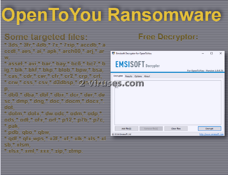 OpenToYou ransomware - ¿Como eliminarlo? 26 enero, 2017 By Giedrius Majauskas Presentar virus cripto ransomware que han sido conquistados con éxito y enviados al cementerio es un verdadero placer. El virus OpenToYou es una muestra que identificamos como eliminada. Deberíamos mencionar que esta infección no es antigua. Por lo que, es sorprendente que los especialistas informáticos hayan podido generar una herramienta de desencriptación apropiada tan rápidamente. Nuestras alabanzas se dirigen a los desarrolladores de Emsisoft que han presentado la herramienta para la desencriptación sólo hacer un par de días, exactamente antes de Año Nuevo. Creemos que es mejor empezar el año con una pizarra en blanco, en lugar de batallar demonios de eras pasadas. De cualquier manera, el virus cripto ransomware OpenToYou ha sido identificado infectando dispositivo y encriptando varios tipos de datos con cifrado RC4. El email de contacto que se deja para contactar con los hackers es [email protected]. A pesar de la curiosidad por los hackers que están detrás de este ataque y lo que quieran decir, no debe enviarles un correo. Ninguna súplica ni amenaza hará que los programadores maliciosos le den los secretos de la desencriptación. Por suerte, el virus OpenToYou ha sido desencriptado y puede descargar el desencriptador, desarrollado por Emsisoft. ¿Qué más podemos decir sobre el ransomware OpenToYou? El virus OpenToYou se pone en el mismo grupo que muchos otros cripto-ransomware. No es extraño cuando se trata de los archivos que son apropiados para su encriptación: se pueden seleccionar una cantidad increíble (y perturbadora) de archivos para encriptar con la pesadilla RC4. Sin embargo, el virus OpenToYou podría no ser un ejemplo complicado, ya que los desarrolladores de seguridad han conseguido crear una herramienta funcional y gratuita, para recuperar los datos arruinados. Las víctimas han indicado que todo tipo de archivos han sido corrompidos: desde .doc, .docm, .docx, .odt, .png, .jpg hasta otros cientos de extensiones que casi cualquier archivo puede tener. La investigación sobre el virus OpenToYou también descubrió que incluso esos archivos que no tenían ninguna extensión se seleccionaban para la encriptación. Para separar los datos codificados de los ejecutables normales, cada pieza de datos va a adjuntarse con la dirección email [email protected] de los hackers. Sugerimos que es otra sugerencia para contactar con los desarrolladores del ransomware OpenToYou y aprender sobre sus verdaderas intenciones, como el rescate presentado no es tan informativo (se llama !!!.txt). El mensaje de los hackers va a verse en dos lugares: como nuevo fondo de escritorio y en el ejecutable .txt. El anterior va a contener la clave de identificación original que será diferente para cada víctima del ransomware OpenToYou. Sin embargo, aunque el ransomware sea una amenaza para una gran cantidad de archivos, es importante saber dónde se guarda el ejecutable en el sistema. El virus OpenToYou parece evitar algunas carpetas y deja sus datos intactos. Ejemplos de dichas categorías: Program Files, Intel, Inicio, PerfLogs, Driver, Windows, Logs y algunas otras. Esto significa que los datos en estas secciones están seguros de una infección de ransomware. Sin embargo, los datos en otras carpetas están más que disponibles para la encriptación. Buenas noticias: puede desencriptar los archivos que han sido corrompidos por el ransomware OpenToYou El virus OpenToYou puede añadirse a las variantes que han sido desencriptadas: puede descargar una herramienta gratuita para la desencriptación desde la web oficial de Emsisoft. Si tiene problemas para detectar el lugar exacto, simplemente haga clic aquí y le redirigiremos a la parte adecuada. Esto significa que si está infectado con el ransomware OpenToYou, no tendrá que sufrir de pérdidas importantes financieras o de datos. Sin embargo, estas noticias positivas no pueden aplicarse a todos los ransomwares presentes. Algunos de ellos son difíciles de desencriptar. Eso significa que es importante saber maneras apropiadas para proteger sus datos de algoritmos para la encriptación. Si tiene sus preciados archivos almacenados en copias de seguridad, no le importará que sus originales estén encriptados: será capaz de recuperar las copias de esos archivos y funcionarán perfectamente. Aspectos relacionados con la transmisión del ransomware OpenToYou Es posible que la carga del ransomware OpenToYou se distribuya en emails maliciosos. Este es un consejo para el futuro: nunca abra correos que se anuncien como extremadamente urgentes, pero sus errores gramáticos y direcciones email indican que esta podría no ser una carta fiable. La mayoría de las veces, los emails contendrán un adjunto que tendrá que descargar para poder infectarse con el ransomware. Sin embargo, una nueva investigación ha descubierto que los hackers son capaces de infectar a la gente incluso simplemente abriendo los emails que reciben. Spyhunter son las herramientas profesionales que se ha estado perdiendo: estos programas arreglarán automáticamente el ransomware OpenToYou. Las secciones siguientes explicarán la eliminación manual y desencriptación, pero no debería preocuparle ya que puede aprovechar la ventaja de la herramienta, generada por Emsisoft. ¿Cómo eliminar OpenToYou ransomware usando Restauración del Sistema? 1. Reinicie su ordenador en Modo Seguro con Solicitud de Comando 1. Modo seguro Para Windows 7/ Vista/ XP l Inicio → Apagar → Reiniciar → OK. l Presione la tecla F8 repetidamente hasta que la pantalla de Opciones de Inicio Avanzado aparece. l Elegir Modo Seguro con Solicitud de Comando. Para Windows 8 / 10 l Presione Potencia en la pantalla de acceso de Windows. Luego presione y mantenga la tecla Shift y haga clic en Reiniciar. l Elija solucionar problemas → Opciones Avanzadas → Configuración de Inicio y haga clic en Reiniciar. l Cuando se c