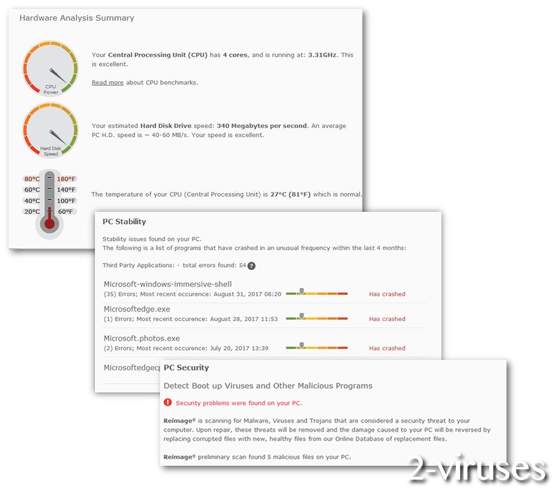 Reimage Repair 8 junio, 2016 By Giedrius Majauskas Reimage Repair es una herramienta reparadora de Windows que clasificamos como un escáner de emergencia. Al igual que otras herramientas de esta categoría, busca solucionar problemas informáticos después de que hayan ocurrido y reparar el ordenador para que vuelva a tener un rendimiento óptimo. Este escáner de emergencia está disponible en todas las plataformas más populares, incluyendo SO Windows, SO Macs e incluso Android. Usar el reparador Reimage Repair como reparador de problemas del SO Windows podría ser la mejor solución – puede restaurar y/o arreglar los archivos de Windows dañados o modificados. Como muchos usuarios se frustran por los problemas causados por las infecciones en los archivos del SO Windows, Reimage Repair puede ser útil para no tener que reinstalar por completo su sistema operativo. Sin embargo, es importante saber que esta herramienta de reparación no puede arreglar problemas relacionados con software, sólo es efectivo con el SO. Reimage Repair es una herramienta todoterreno, así que, cuando descargues una versión gratuita de esta herramienta y realices un escaneado rápido, indicará todos los virus, malware y archivos dañados o que faltan en su sistema. Si los problemas que tiene con su ordenador son debidos a algo que puede solucionar esta herramienta de reparación, se le ofrecerá comprar una licencia Premium que es de 37.95$ al año para tener todas las funciones y herramientas disponibles. En caso de que el problema esté relacionado al software u otro factor que no esté disponible para arreglar con la reparación de Reimage Repair, se le notificará sobre ello, así que ahorra mucho tiempo. El escaneado rápido sólo tarda unos 5 minutos (dependiendo de la cantidad de archivos y programas que tenga en su sistema) y al final, se le proporcionará un informe fácil de entender sobre la salud de su ordenador. La versión de prueba del programa es gratuita durante tiempo ilimitado, así que, en caso de que sólo necesite la herramienta de escaneado, no le costará ni un céntimo. Las versión Premium incluye una garantía de devolución del dinero de 60 días, en caso de que no esté satisfecho con los resultados, por ello, definitivamente vale la pena probarlo. Hablando de detección y eliminación de software – otras herramientas Anti-Malware como SpyHunter o Plumbytes pueden ofrecerle unas altas tasas de detección ya que sus bases de datos de virus son mayores y se actualizan más frecuentemente. Sin embargo, Reimage Repair sigue siendo capaz de enfrentarse de manera efectiva a la mayoría de infecciones de malware. El escáner Reimage Repair pasa por tres fases: Hardware, Seguridad y Estabilidad. En primer lugar, el programa comprueba la situación con la memoria de su sistema, velocidad del disco duro, parámetros de CPU, etc. El Reparador de PC Automatizado Reimage Repair puede ayudarle a arreglar errores de Windows, caídas informáticas, DLLs corruptos y otros daños similares. Entonces, empieza a hacer comprobaciones de seguridad, dónde detecta todo tipo de amenazas, como adware, spyware, rootkits, troyanos, gusanos, etc. y ayuda a eliminarlos. Por último, monitoriza la estabilidad del sistema e identifica qué programas tienden a paralizarlo. No se han notado falsos positivos en los escaneados de Reimage Repair. Lo único que podría decepcionar un poco – que se usa un algoritmo de detección mejor en la versión de pago del software. Eso es poco justo para los usuarios que deciden si comprar o no el programa, ya que el producto final será diferente (juran que será mejor). Una de las mayores ventajas sobre otras herramientas similares es la versión dedicada para Mac. Reimage Repair es una opción genial si está buscando un software para Mac. Se deshará fácilmente de todas las aplicaciones no deseadas que se hayan instalado por el usuario de manera intencional o accidental. Además, limpia los historiales de navegación, arregla errores y ayuda a los usuarios a deshacerse del espacio del caché. Puede usar esta herramienta a diario para revisar su sistema y mantenerlo funcionando de manera rápida y fluida. Reimage Repair para Mac no proporciona seguridad para el dispositivo. Por lo que, también debería obtener un antivirus fiable. También, no todas las herramientas de reparación de sistema pueden ofrecerle ayuda con el SO Android, pero no es el caso de Reimage Repair. El programa es capaz de ayudar a los usuarios que tengan dispositivos Android. Si le preocupa si las apps que tiene instaladas en su dispositivo son seguras de usar o no, debe considerar obtener Reimage Repair para Android. Una vez instalado, el programa iniciará un escaneado de su dispositivo e identificará los problemas. Detecta apps maliciosas y ayuda a limpiar lo que ocupe mucha memoria en su dispositivo, como historial de llamadas/texto, memoria en caché y más cosas. Lo bueno sobre Reimage Repair para Android es que no necesita pagar nada para usar su servicio. Así que, si está cansado de tener problemas con su teléfono o tablet, no dude en probar esta herramienta. Probablemente el punto más flaco de este software es un servicio de atención al cliente pobre. En comparación con la atención al cliente de SpyHunter o Malwarebytes, Reimage Repair repair tiene margen para la mejora. Básicamente todo lo que puede hacer para ponerse en contacto con los técnicos profesionales es enviar un ticket a su sistema de atención al cliente y esperar que le respondan pronto. Sin embargo, debería ser suficiente si no esperaba una respuesta en minutos. Otro punto no tan bueno – los escaneados automáticos cada vez que ejecute el programa. Sí, no le causarán ningún problema ya que comprueba el estado de su sistema muy a menudo, pero realmente es innecesario. Por suerte, el programa no requiere una gran cantidad de recursos de CPU, así que no lo notará en el rendimiento del sistema. En resumen, 
